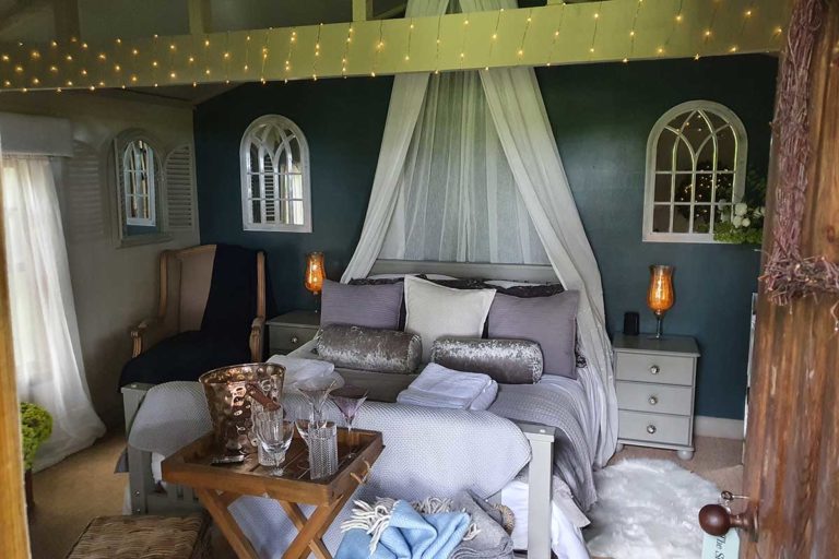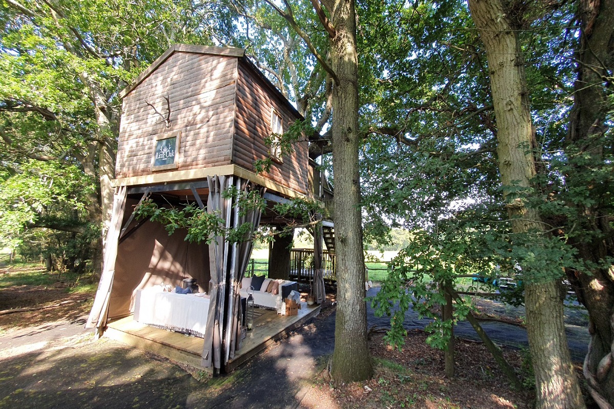 This is an idyllic and secluded spot, set in the heart of 26 acres of farmland, in the middle of a lovely woodland glade. The are 4 levels; the decking below the treehouse housing a teak table and chair set, the ground floor with large sofa area, ideal for lounging. The first floor, a love seat to enjoy the views from and the top floor has a small table and chairs for two; perfect for morning coffee. Whilst the bedroom is beautifully decorated in muted tones reflecting the tranquil surroundings.